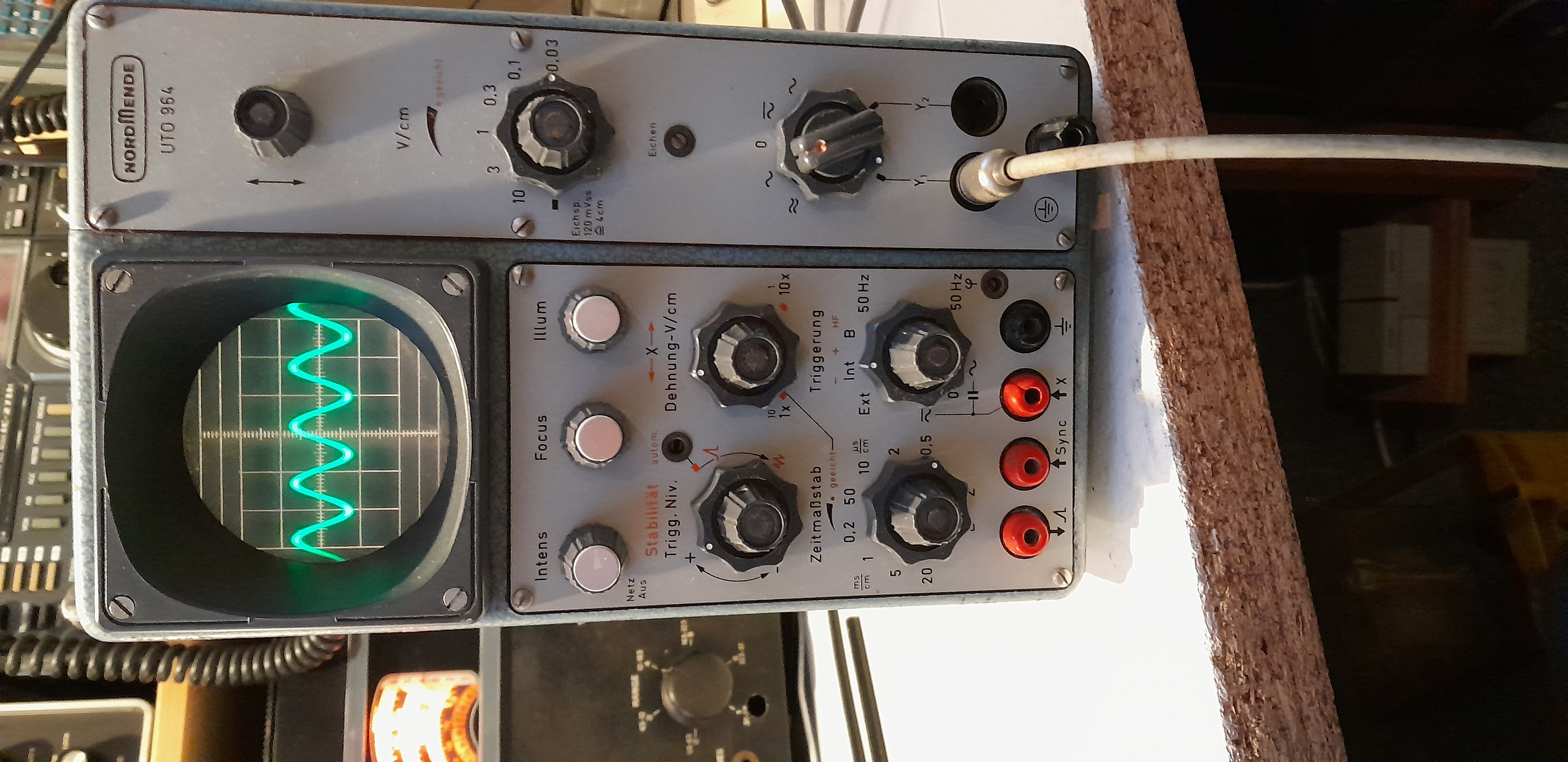2 Eingänge umschaltbar (Gleichspannung, Wechselspannung). Intensität, Fokus, Helligkeit einstellbar, Eichjustage, trigger-bar, Sägezahn-Ausgang